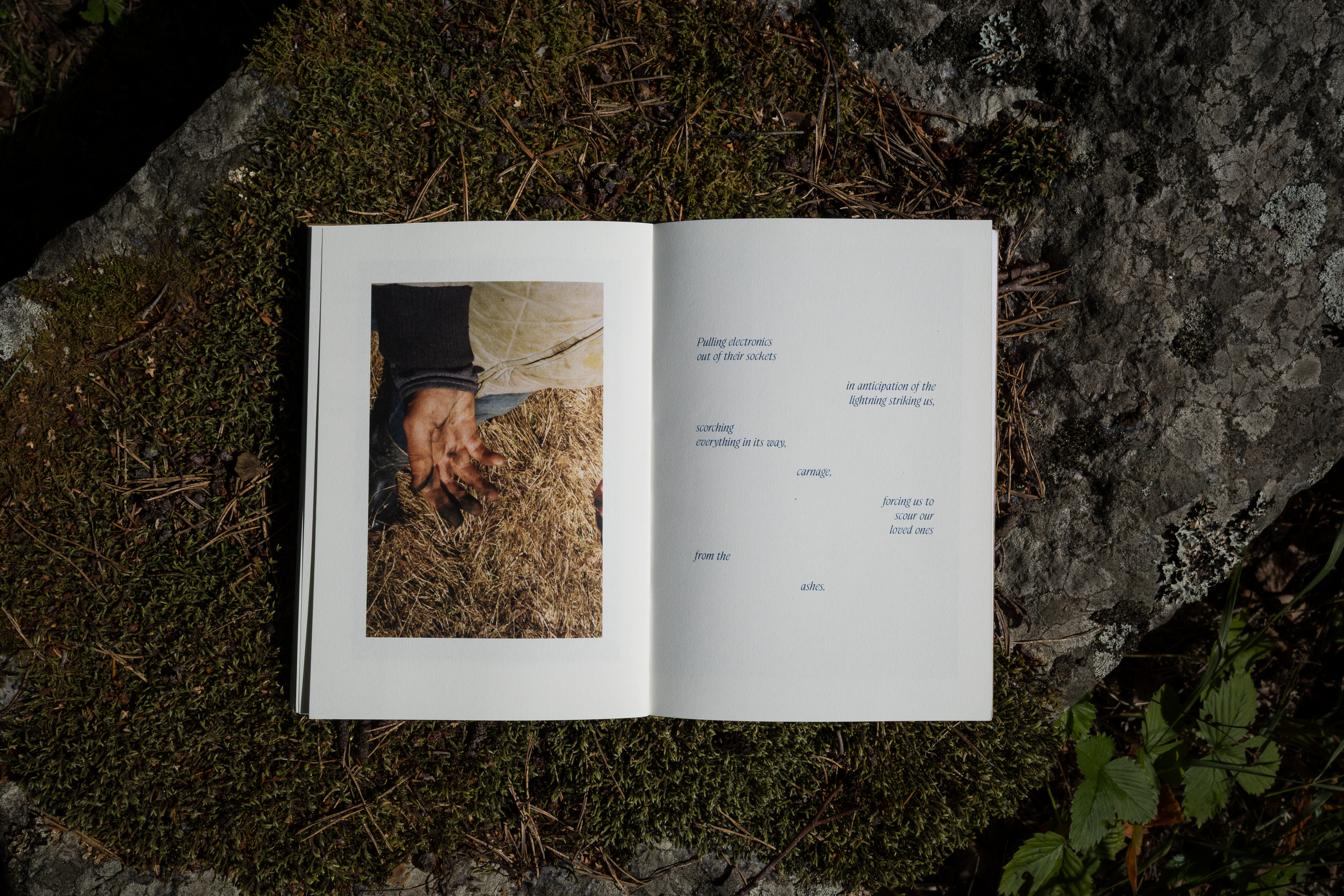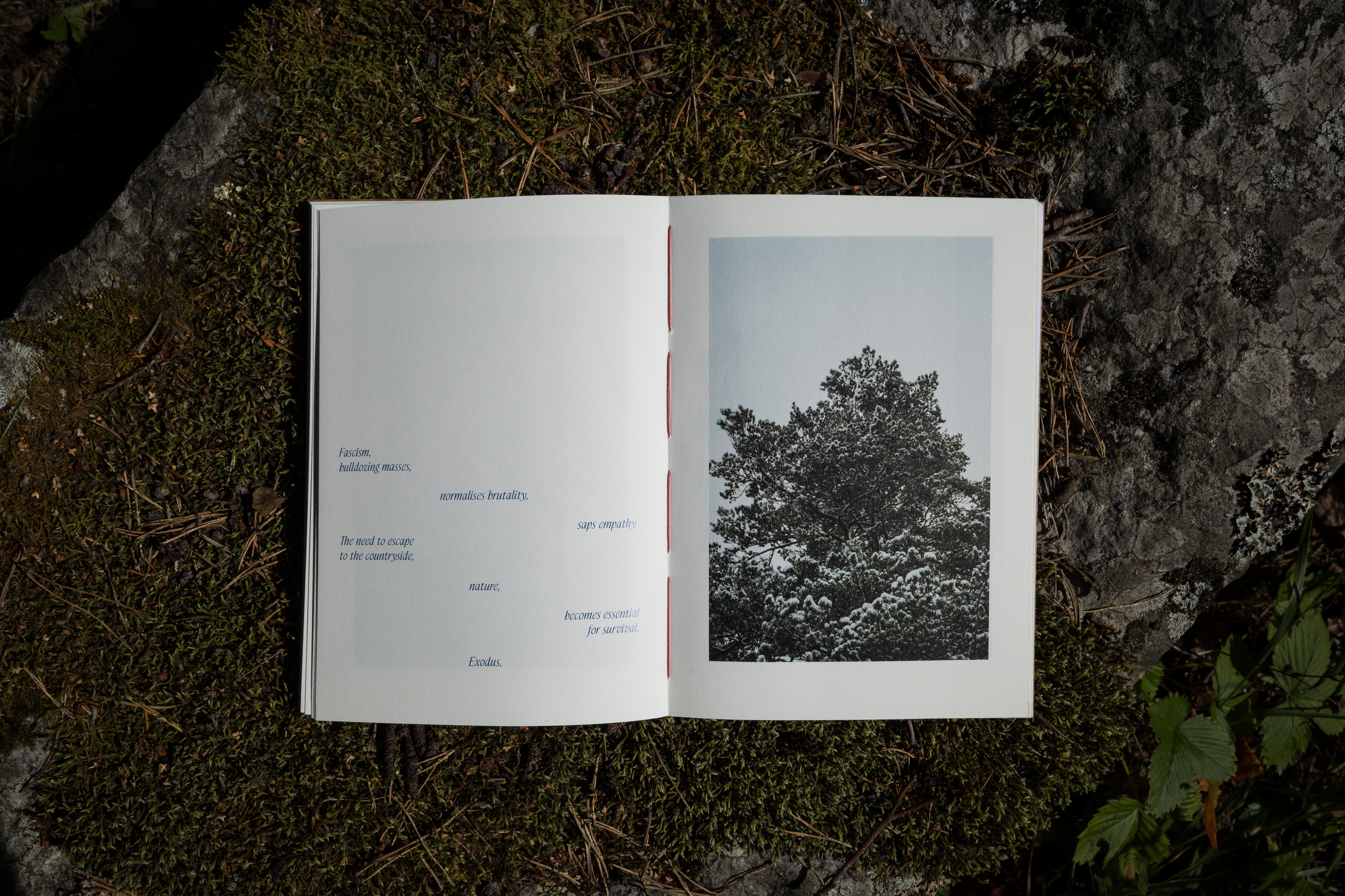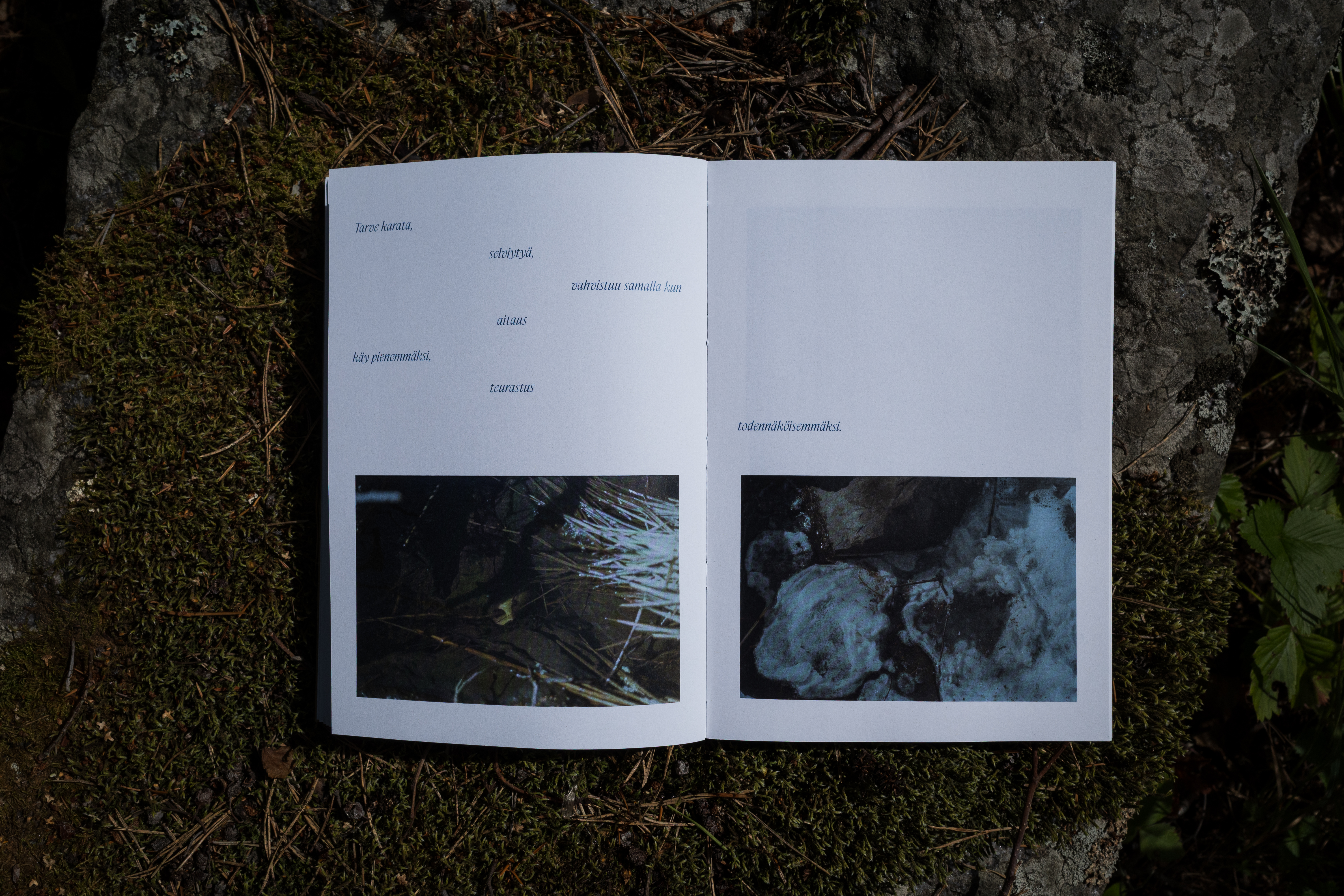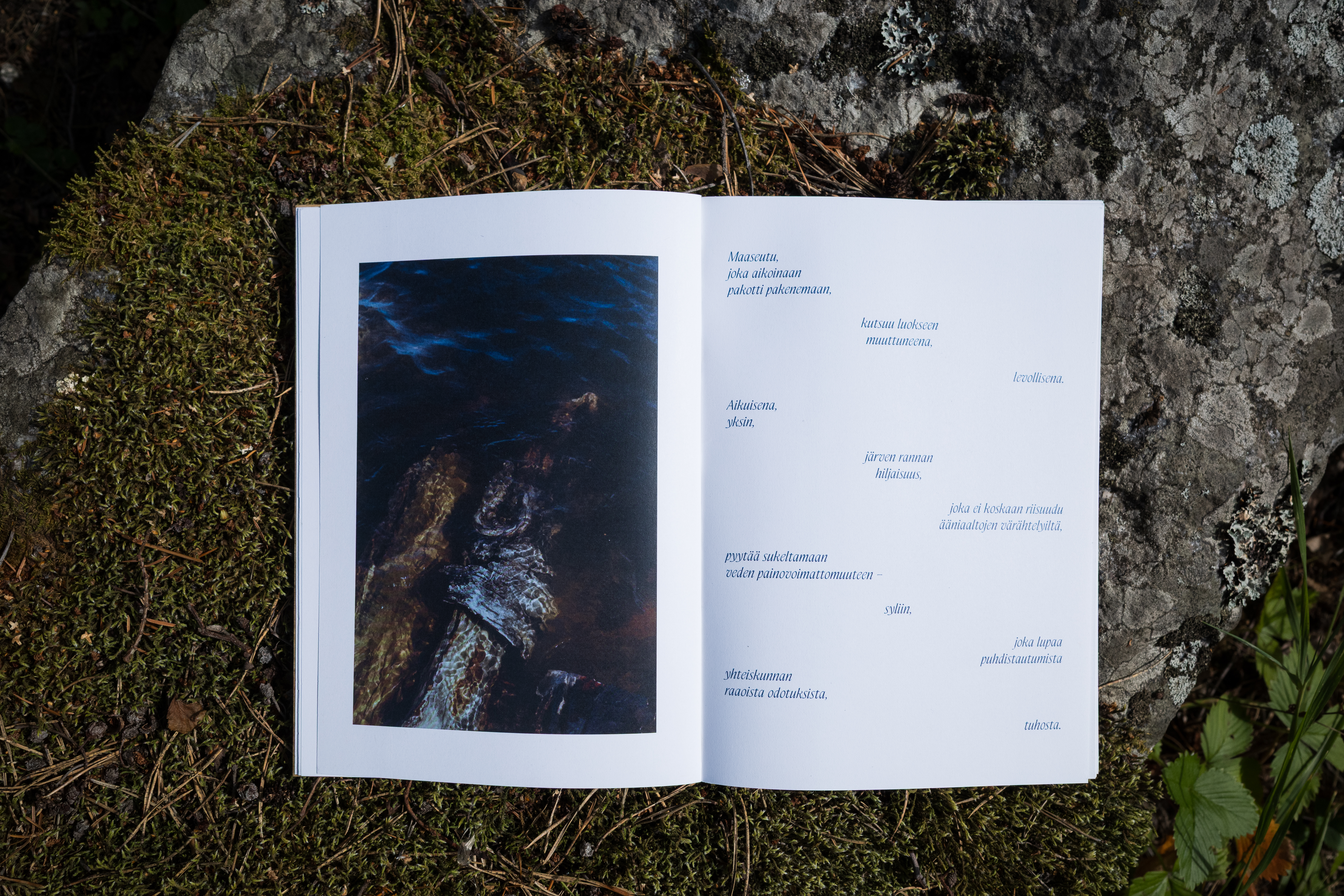 The book includes Finnish and English versions of the same text, which is written in a poetic form. It explores nature’s bodily characterisations and the emotions invoked by the societal climate. I aspire to expand on this dialogue by including 35mm photography to respond to the text. The photography is a collection of pieces I’ve taken of my childhood village from 2018 to 2025.
